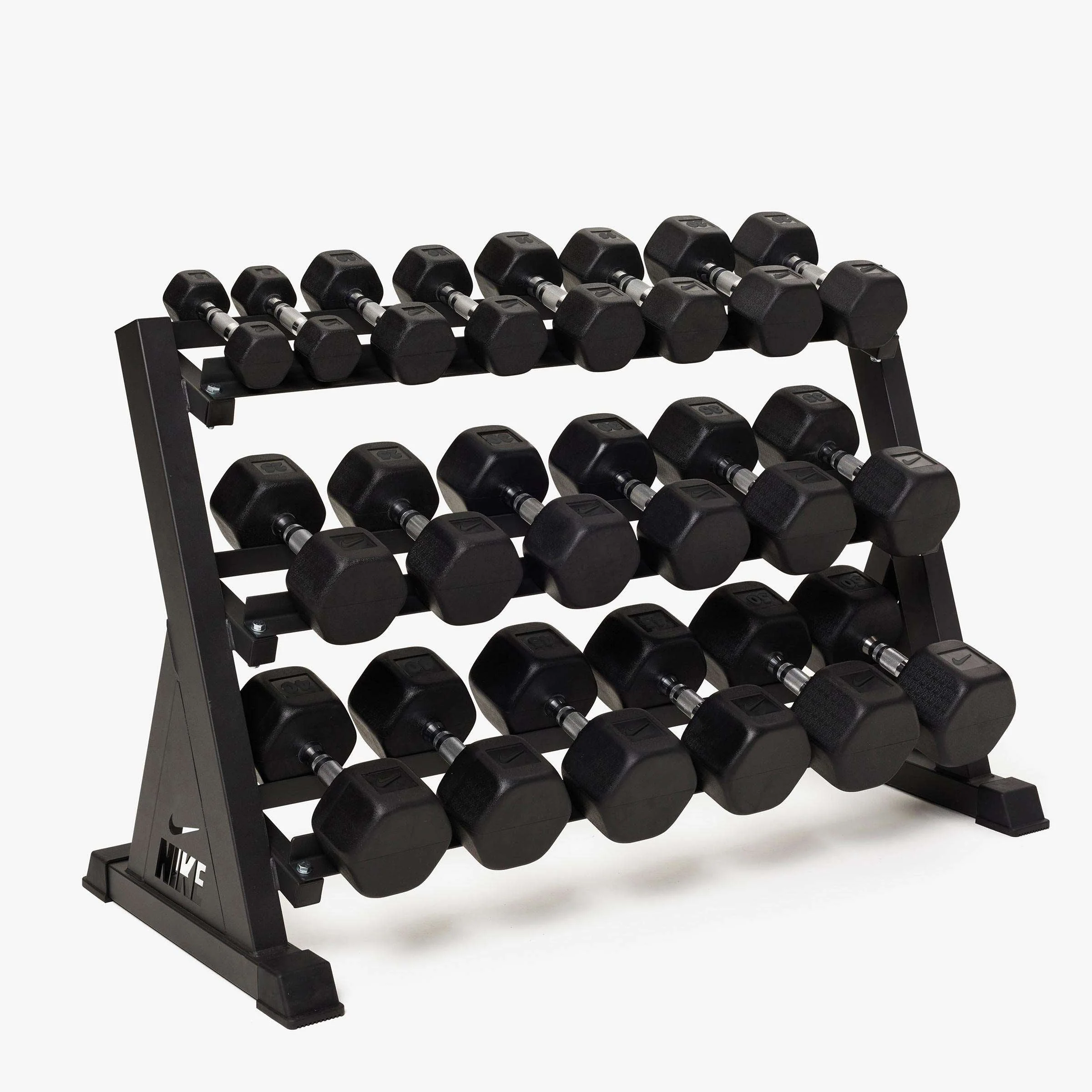 The Nike Dumbbell Rack Set features our most popular dumbbells and a storage rack that allows you to fully stock your home gym for almost any dumbbell workout. With prominent swoosh branding and numbering, robust rubber, and sculpted edges, this dumbbell offers both durability and comfort for all your training sessions.